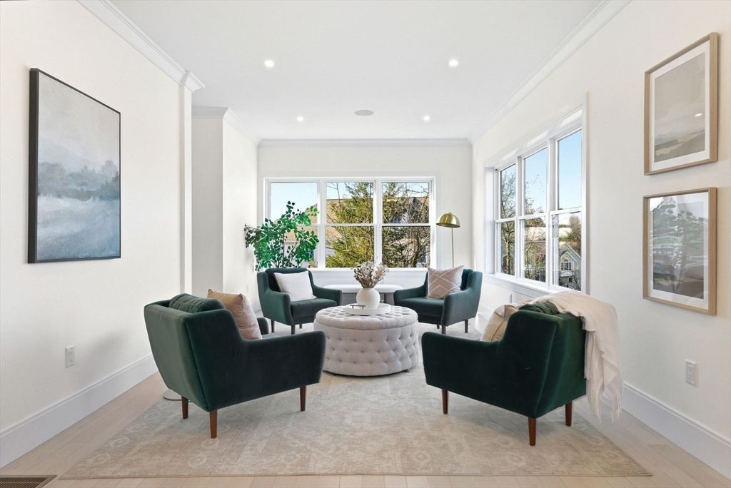 New construction in desirable town of Melrose! This home features 9-ft ceilings and an open floor plan designed for todays buyers. The chefs kitchen offers white cabinetry, quartz countertops, an oversized island, stainless steel appliances w/hood, flowing into a bright family room w/grey ct floor to ceiling fireplace & access to a covered composite deck??perfect for entertaining with Boston skyline views. The dining room w/custom moldings & wet bar connects seamlessly to the kitchen, while a first-floor living room is ideal as a playroom or office. Upstairs includes 4 bedrooms, 3 Baths & Laundry. Luxurious primary suite w/double quartz vanities,...read more