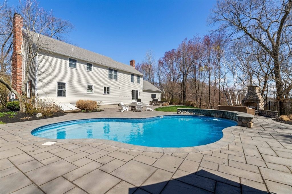 This stunning four-bedroom colonial on a private 2-acre lot offers a resort-style lifestyle ideal for entertaining. The sun-drenched main level features a seamless open-concept floor plan with high ceilings and gleaming hardwoods. Heart of the home is a renovated kitchen with high-end cabinetry, new appliances, a social island, and indoor beverage fridge, flowing into a living area anchored by a fieldstone fireplace. Main floor includes a second living area and updated half bath. Bathrooms feature marble and high-end finishes. Primary suite offers a fireplace, walk-in closet, and spa-inspired bath. Fully finished lower level provides a flexible...read more