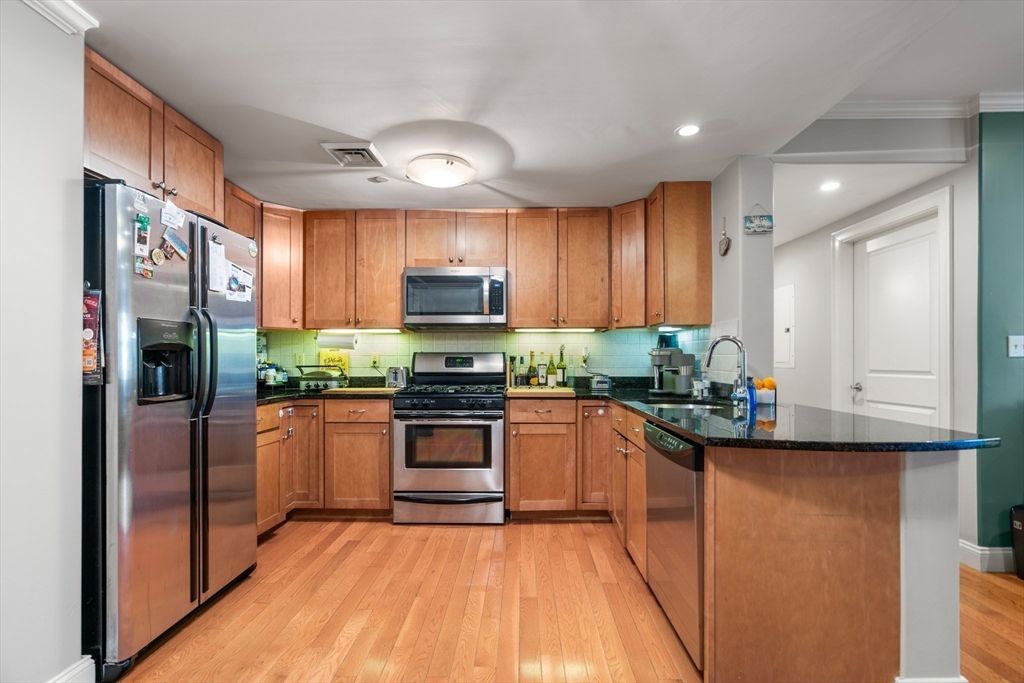 Discover desirable urban elegance at 426 Main Street in the heart of downtown Stoneham. This newer second- floor condo features crown molding, 9-foot ceilings, spacious kitchen with stainless steel appliances & granite countertops. The 2 bedroom and 2 bath unit is thoughtfully laid out to maximize space. The hardwood floors flow throughout this open concept living space which welcomes you with a seating area with electric fireplace and dining spot, ideal for entertaining. The main bedroom wing with huge walk-in closet and an en-suite bathroom showcasing marble floors and double vanity. The second bedroom includes a large closet space, recessed...read more